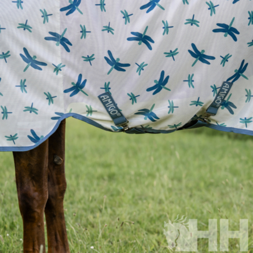 Manta realizada en poliéster ultra transpirable para proteger al caballo de todo tipo de insectos. Incorpora capucha para el cuello y el sistema patentado de diseño en arco para la posición de las manos del caballo y que éste pueda moverse con total libertad. Colores brillantes con propiedades que reflejan el sol, además de una divertida opción de estampado de libélulas.