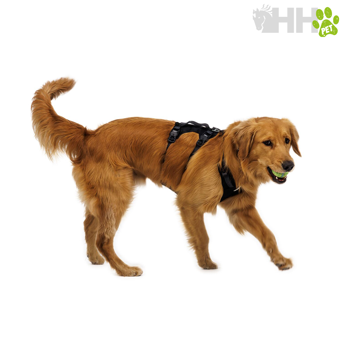 • Tres puntos de fijación para la correa: anilla en V de aluminio y bucle de cinta reforzada en la espalda, así como un bucle de cinta reforzada en el pecho para redirigir a los perros que tiran de la correa.