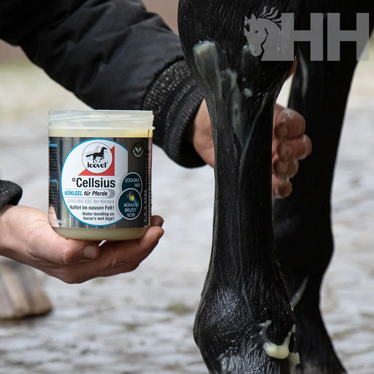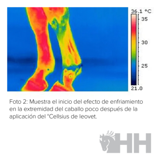 - Conserva el efecto refrescante logrado por la ducha de las extremidades del caballo. Se puede aplicar sobre las manos y pies húmedos y permanecerá en su sitio como un protector refrescante.